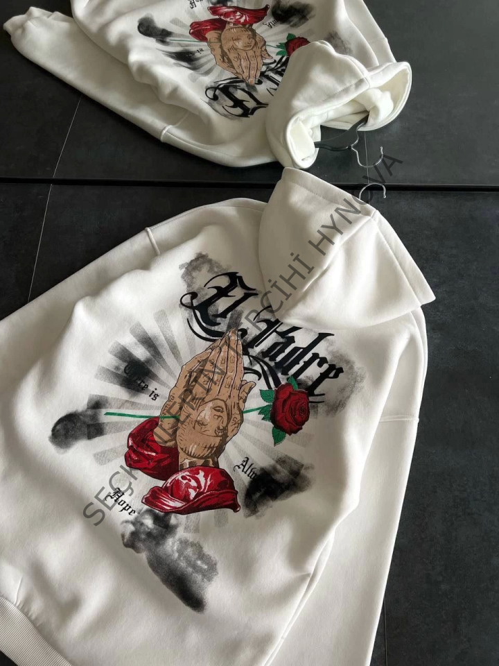 Üç İplik Penye Uzun Kol Kapşonlu Baskılı SweatShirt - Beyaz