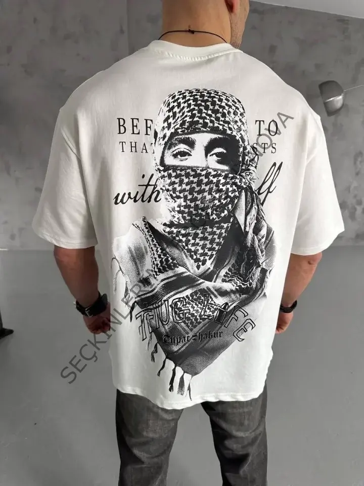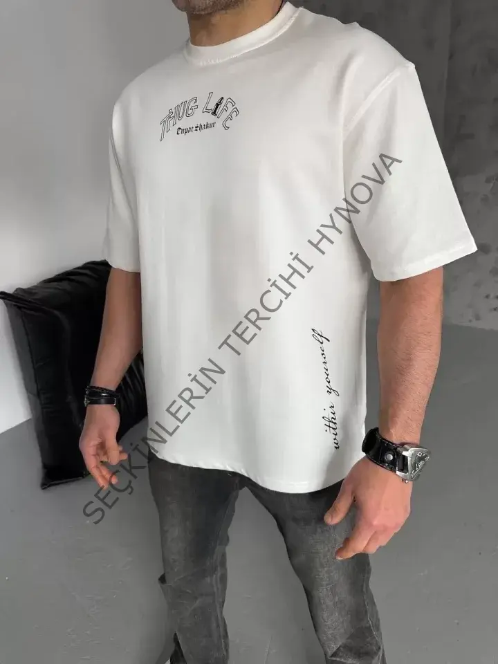 Unisex Baskılı Oversize T-Shirt - Beyaz