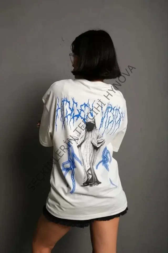 Unisex Bisiklet Yaka Baskılı Oversize T-Shirt - Beyaz 102525