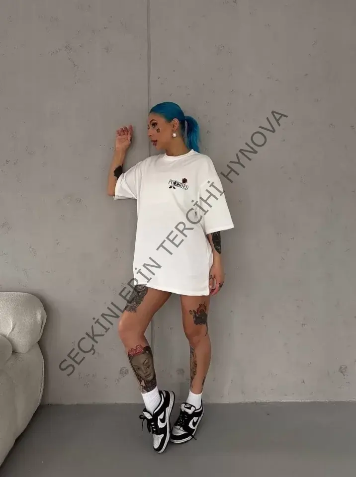 Unisex Bisiklet Yaka Baskılı Oversize T-Shirt - Beyaz
