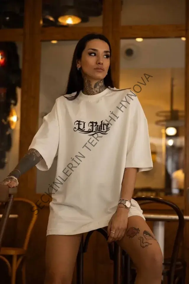 Unisex Bisiklet Yaka Baskılı Oversize T-Shirt - Beyaz