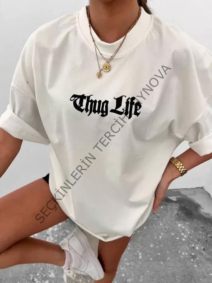 Unisex Bisiklet Yaka Baskılı Oversize T-Shirt - Beyaz 102545