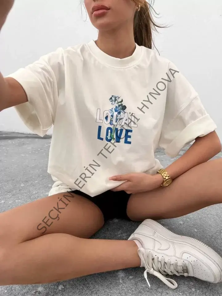 Unisex Bisiklet Yaka Baskılı Oversize T-Shirt - Beyaz