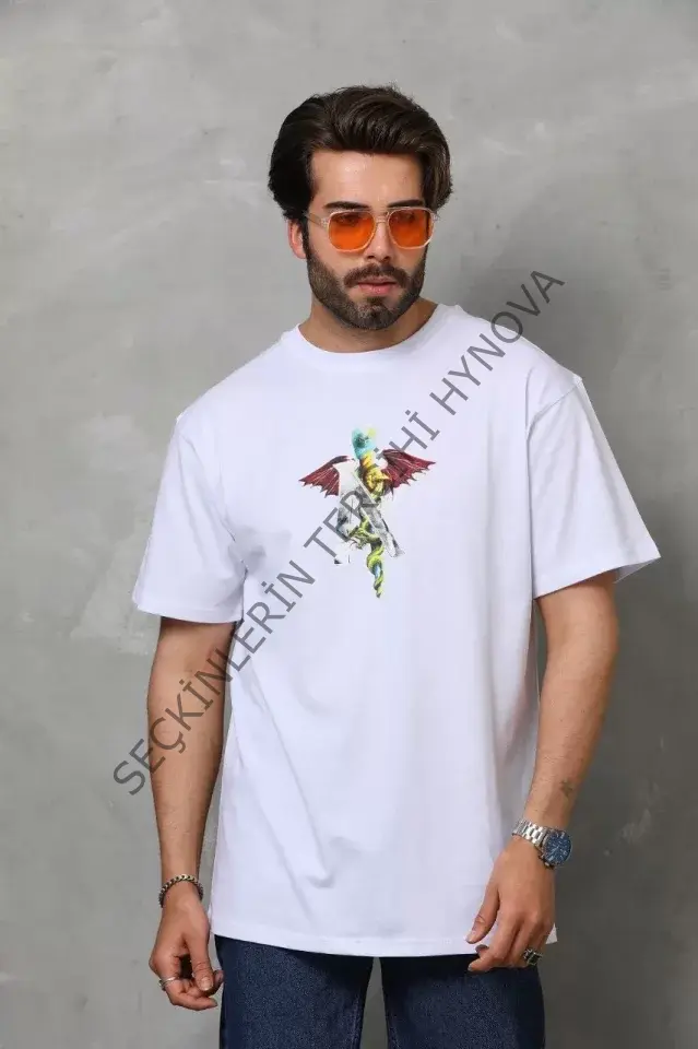 Unisex Bisiklet Yaka Baskılı Oversize T-Shirt - Beyaz