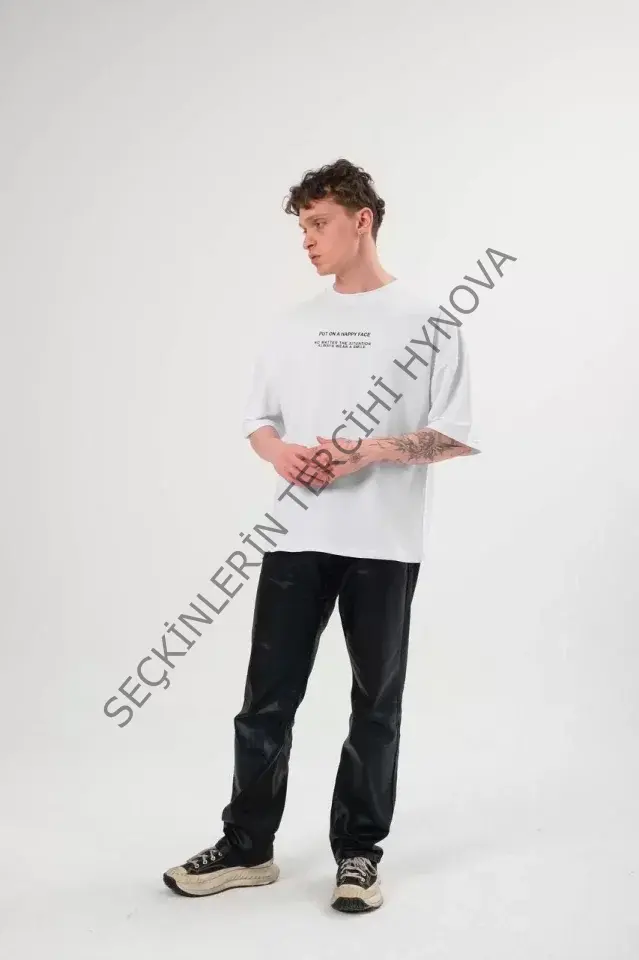 Unisex Bisiklet Yaka Baskılı Oversize T-Shirt - Beyaz 105161