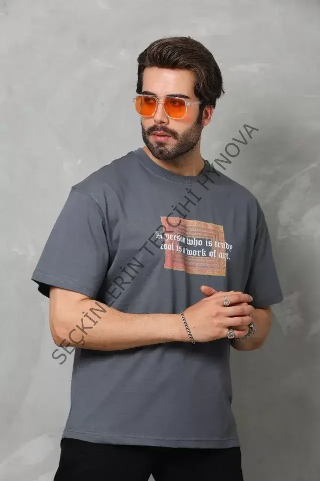 Unisex Bisiklet Yaka Baskılı Oversize T-Shirt - Füme