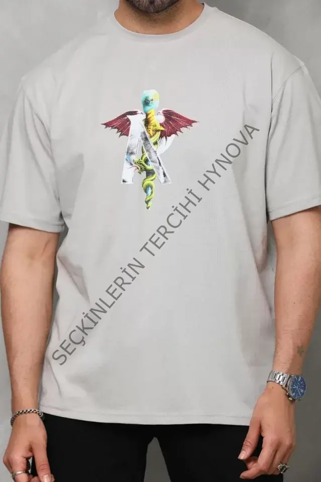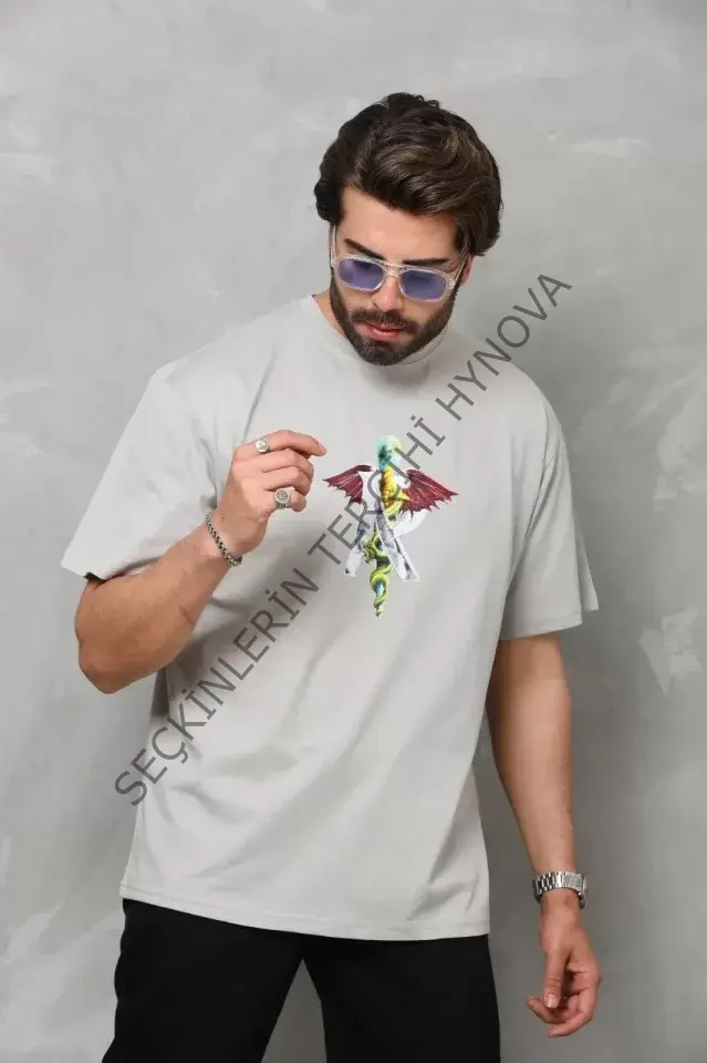 Unisex Bisiklet Yaka Baskılı Oversize T-Shirt - Gri 112402