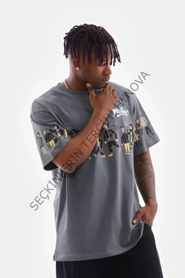 Unisex Bisiklet Yaka Baskılı Oversize T-Shirt - Gri 103375