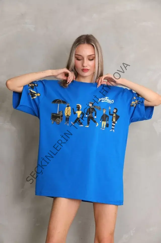 Unisex Bisiklet Yaka Baskılı Oversize T-Shirt - Mavi