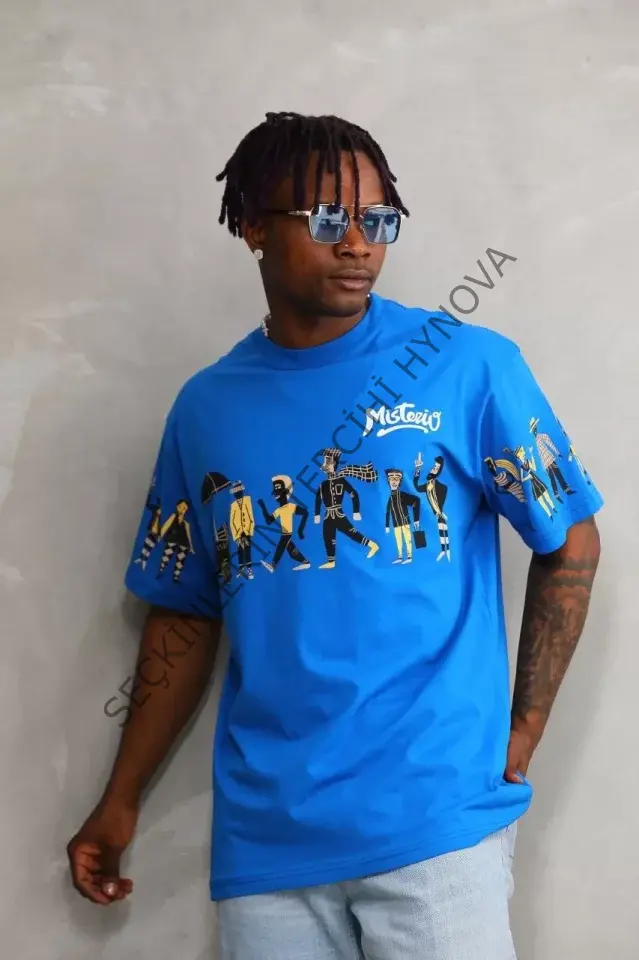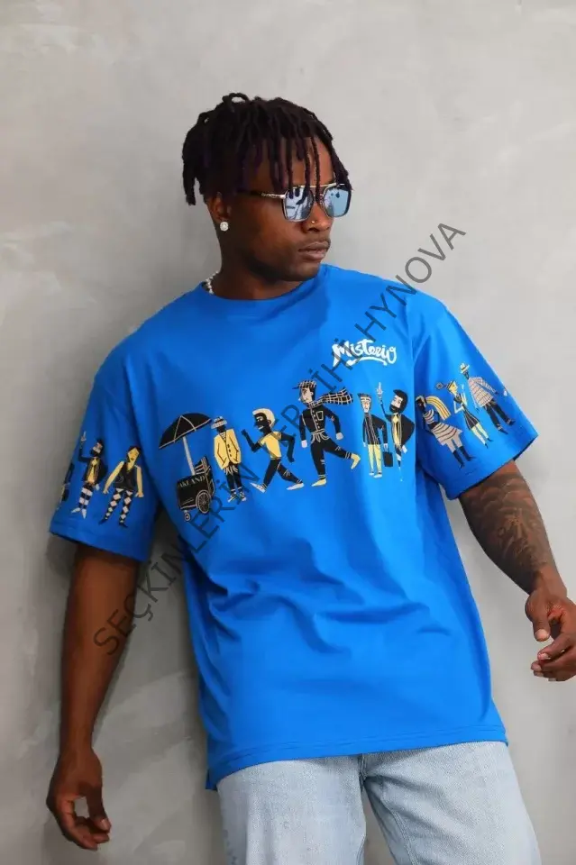 Unisex Bisiklet Yaka Baskılı Oversize T-Shirt - Mavi