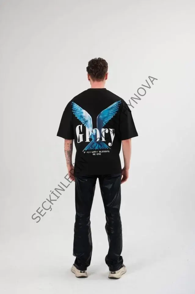 Unisex Bisiklet Yaka Baskılı Oversize T-Shirt - Siyah 102552