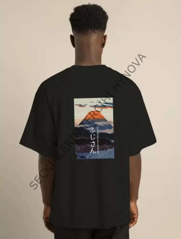 Unisex Bisiklet Yaka Baskılı Oversize T-Shirt - Siyah