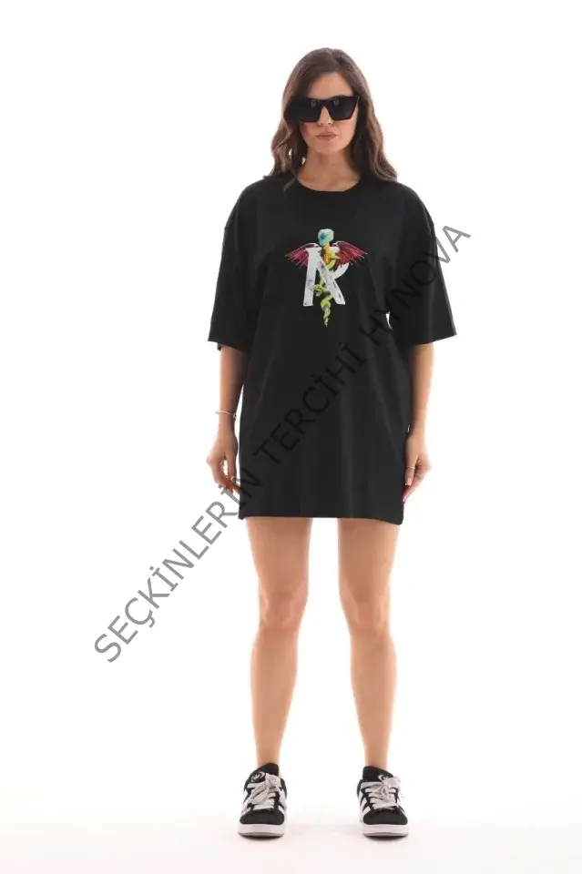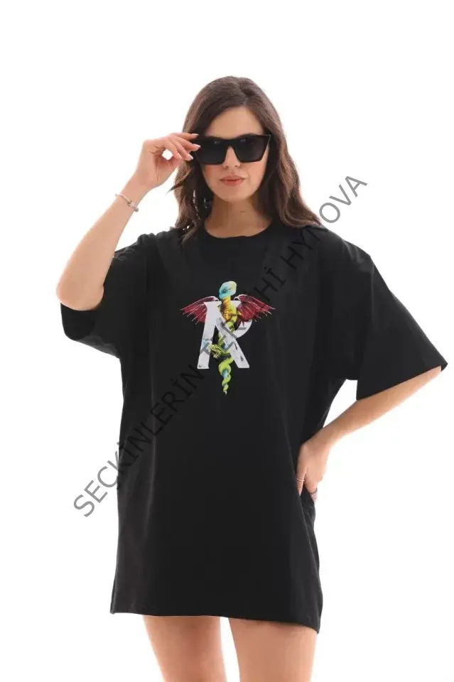 Unisex Bisiklet Yaka Baskılı Oversize T-Shirt - Siyah