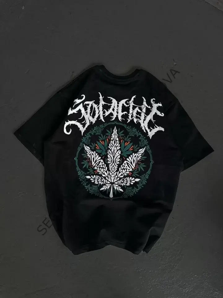 Unisex Bisiklet Yaka Baskılı Oversize T-Shirt - Siyah