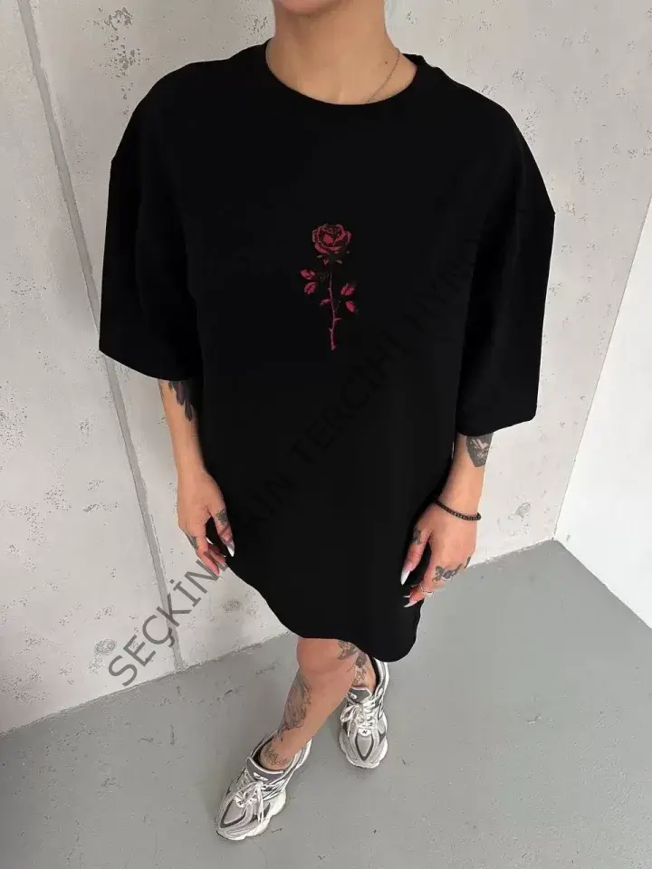 Unisex Bisiklet Yaka Baskılı Oversize T-Shirt - Siyah 102530