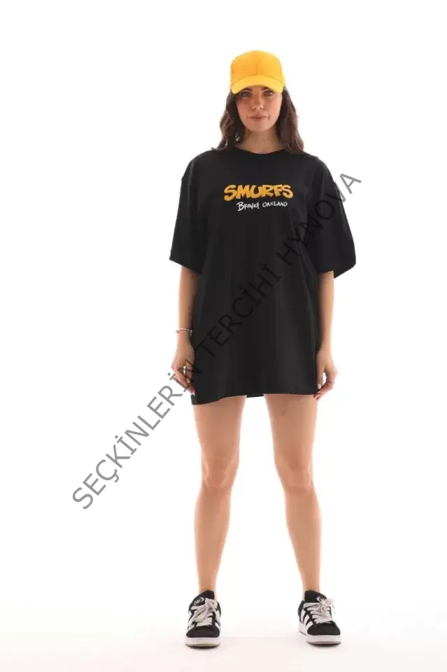 Unisex Bisiklet Yaka Baskılı Oversize T-Shirt - Siyah