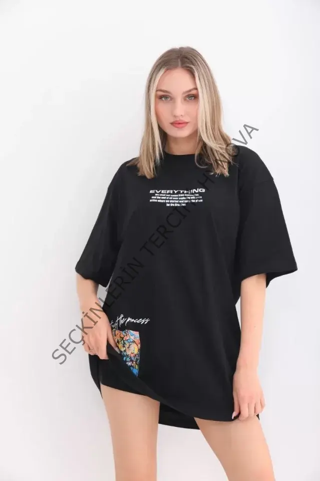 Unisex Bisiklet Yaka Baskılı Oversize T-Shirt - Siyah 103400