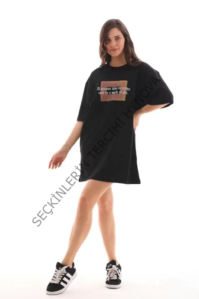 Unisex Bisiklet Yaka Baskılı Oversize T-Shirt - Siyah