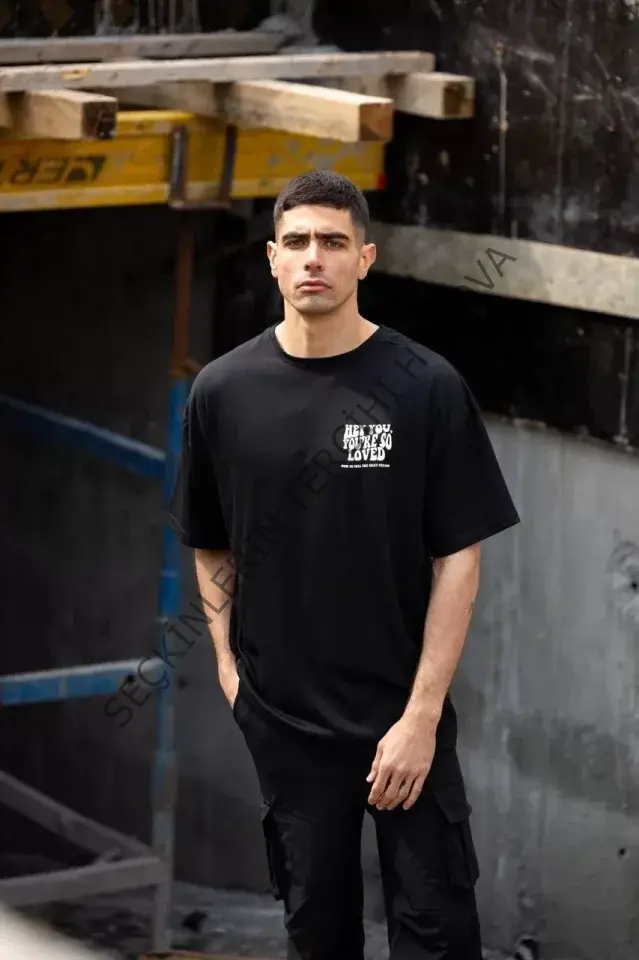 Unisex Bisiklet Yaka Baskılı Oversize T-Shirt - Siyah 117961