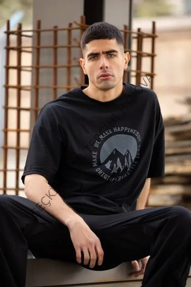 Unisex Bisiklet Yaka Baskılı Oversize T-Shirt - Siyah 117953