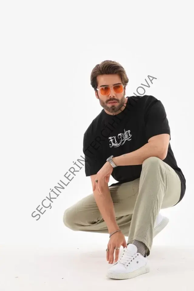 Unisex Bisiklet Yaka Baskılı Oversize T-Shirt - Siyah