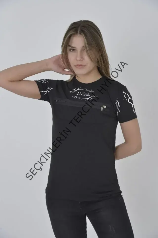 Unisex Göğüs Fermuarlı Baskılı T-Shirt - Siyah