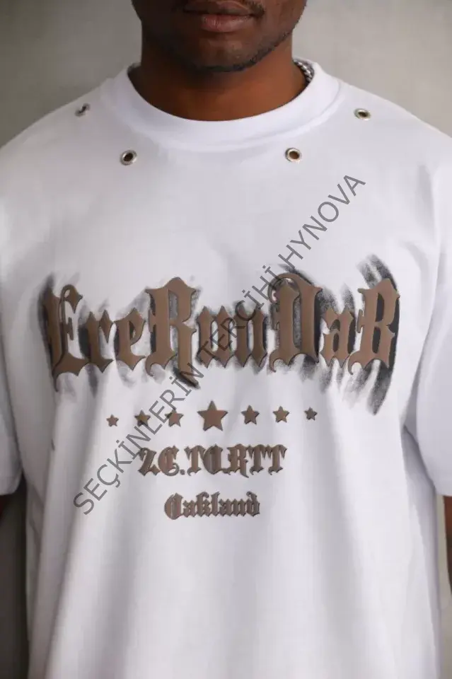 Unisex Kuşgözü Detaylı Baskılı Oversize T-Shirt - Beyaz