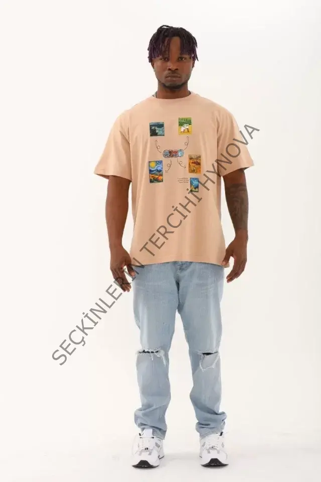 Unisex Oversize Baskılı Bisiklet Yaka T-Shirt - Bej