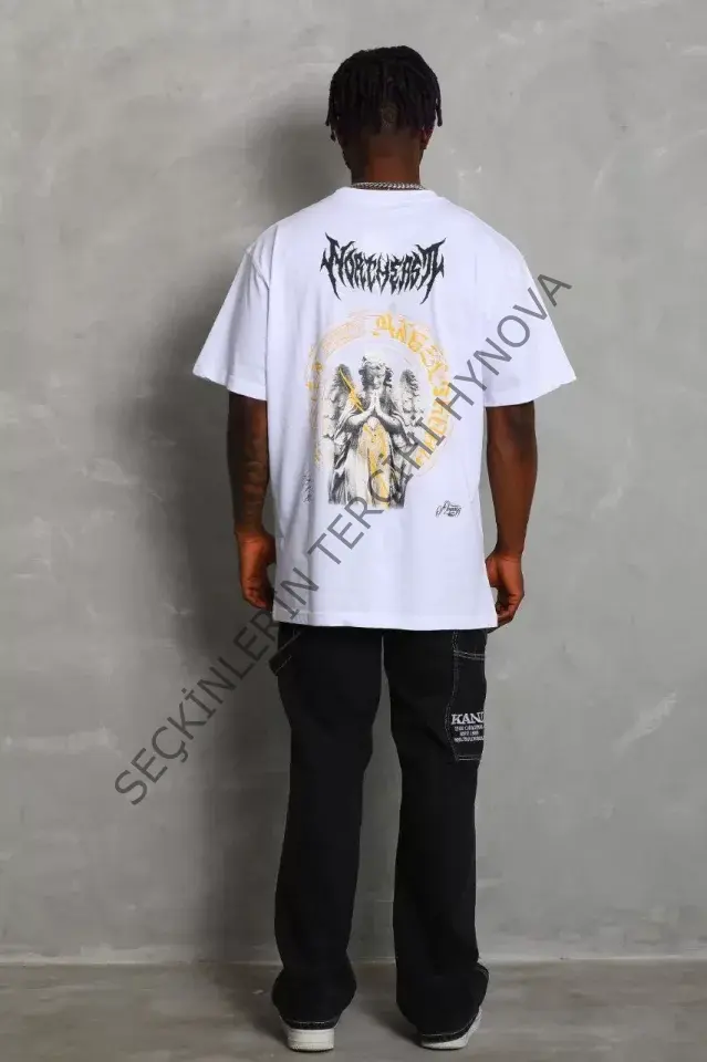 Unisex Oversize Baskılı Bisiklet Yaka T-Shirt - Beyaz 93234