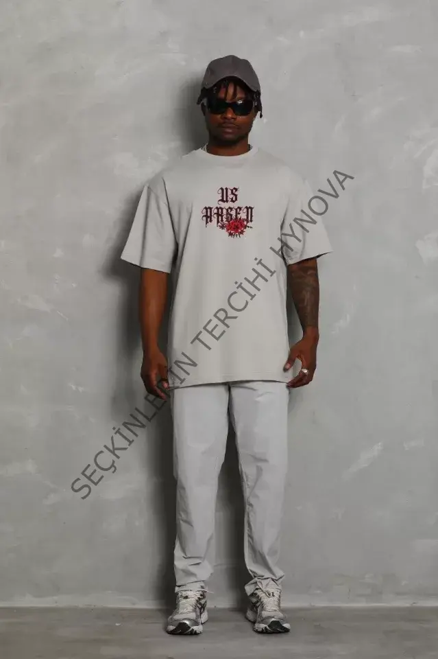 Unisex Oversize Baskılı Bisiklet Yaka T-Shirt - Gri 93190