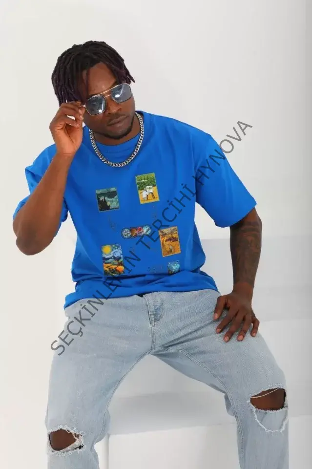 Unisex Oversize Baskılı Bisiklet Yaka T-Shirt - Mavi