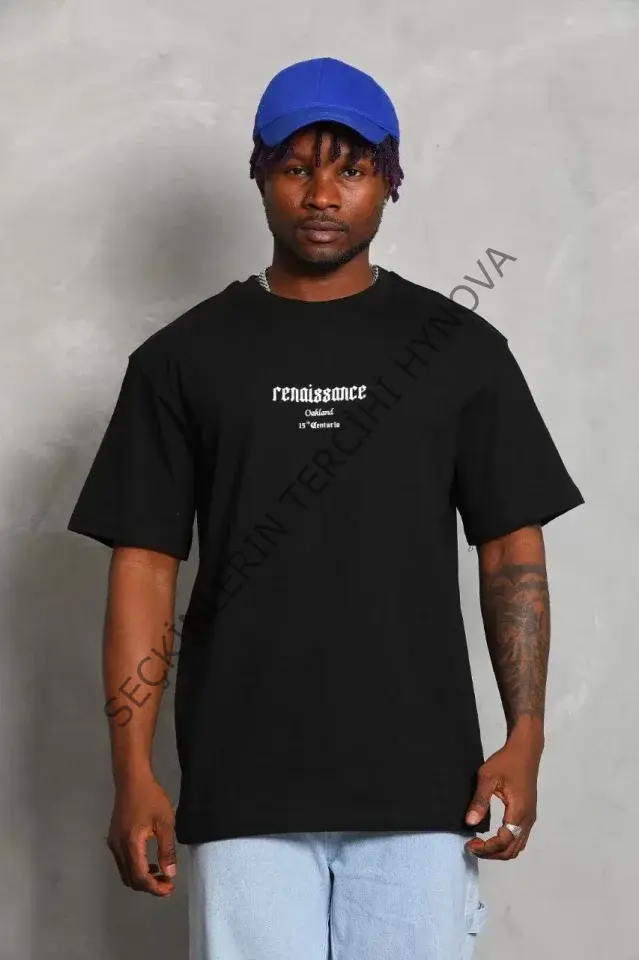 Unisex Oversize Baskılı Bisiklet Yaka T-Shirt - Siyah