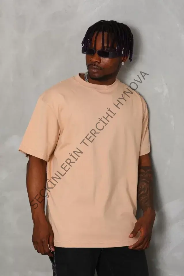 Unisex Oversize Düz Bisiklet Yaka T-Shirt - Bej