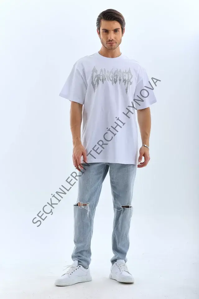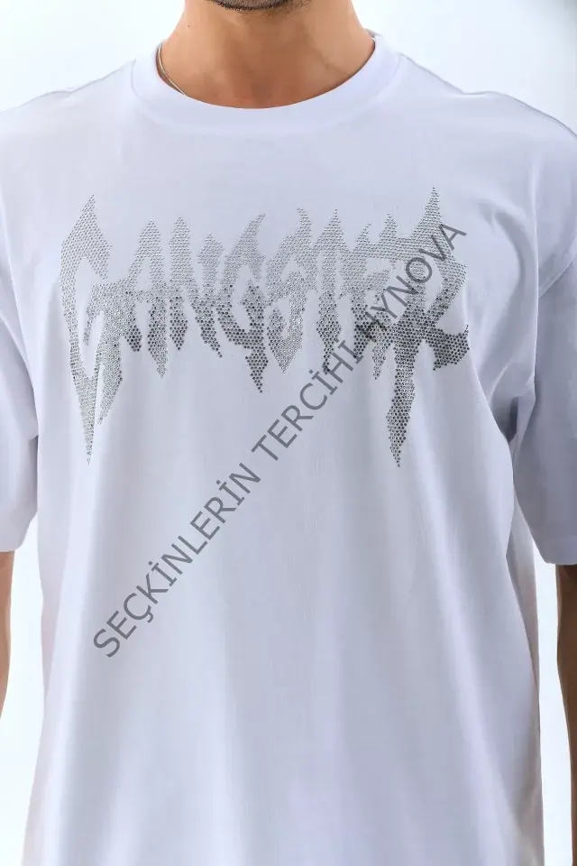 Unisex Oversize Taşlı Bisiklet Yaka T-Shirt - Beyaz