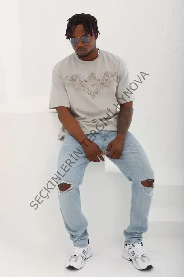 Unisex Oversize Taşlı Bisiklet Yaka T-Shirt - Gri
