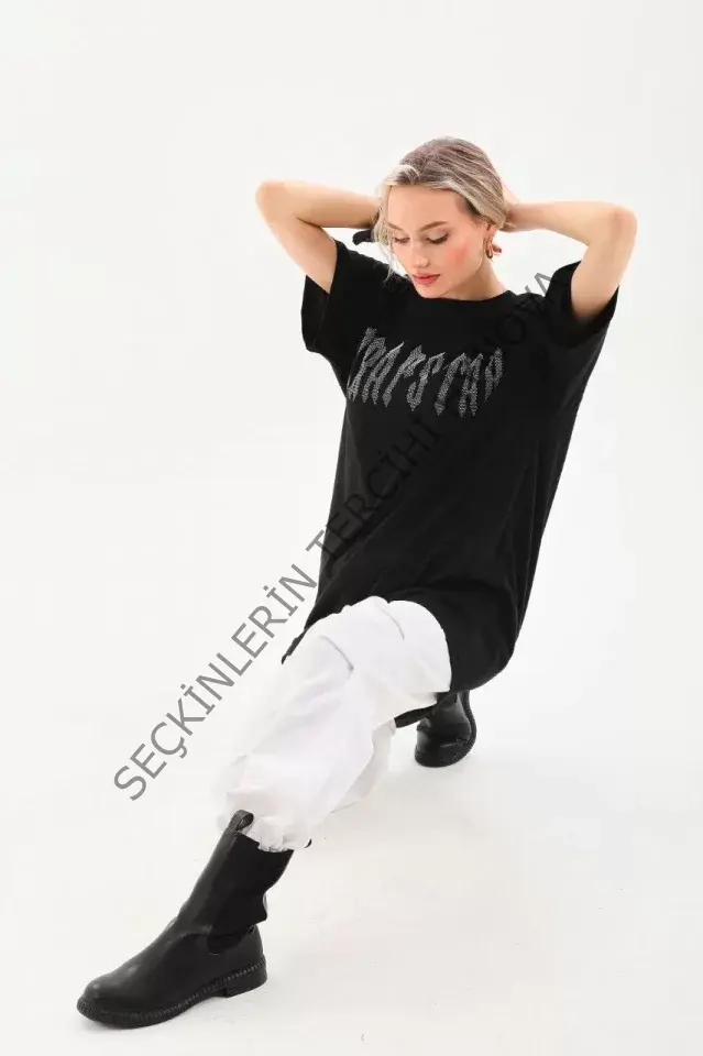 Unisex Taş Desenli Oversize T-Shirt - Siyah