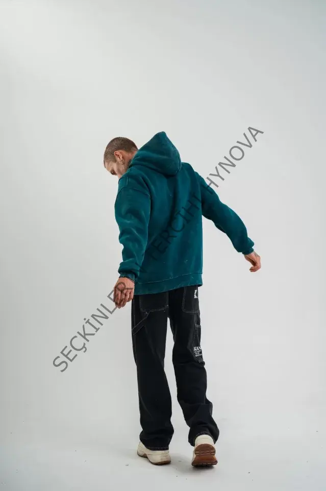 Unisex Uzun Kol Kapşonlu Yıkamalı Nakışlı SweatShirt - Koyu Deniz Yeşili
