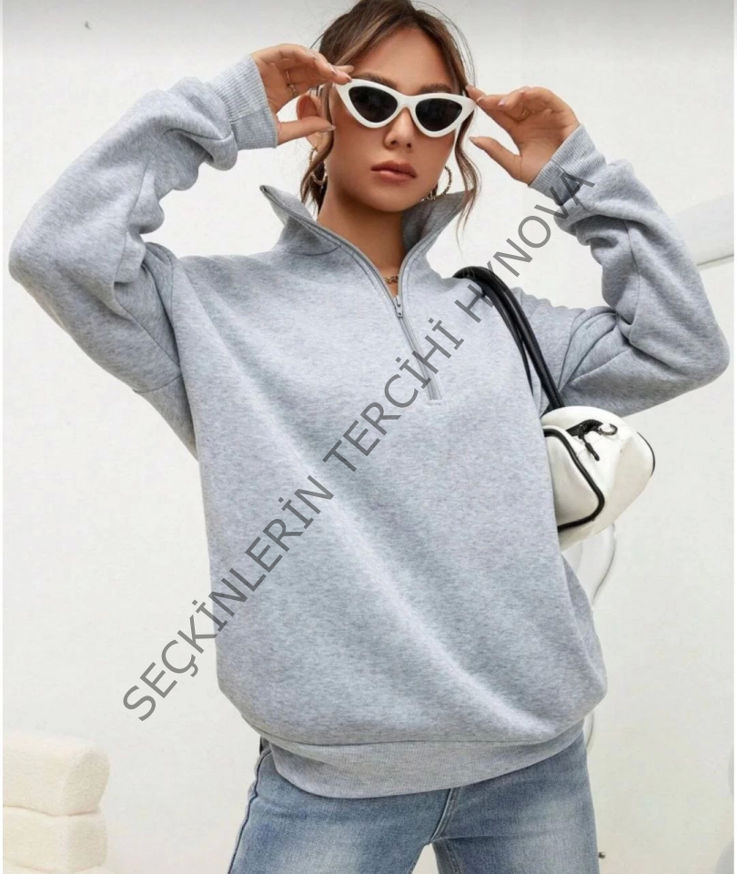Unisex Uzun Kol Yarım Farmuarlı Yakalı Basic SweatShirt - Gri