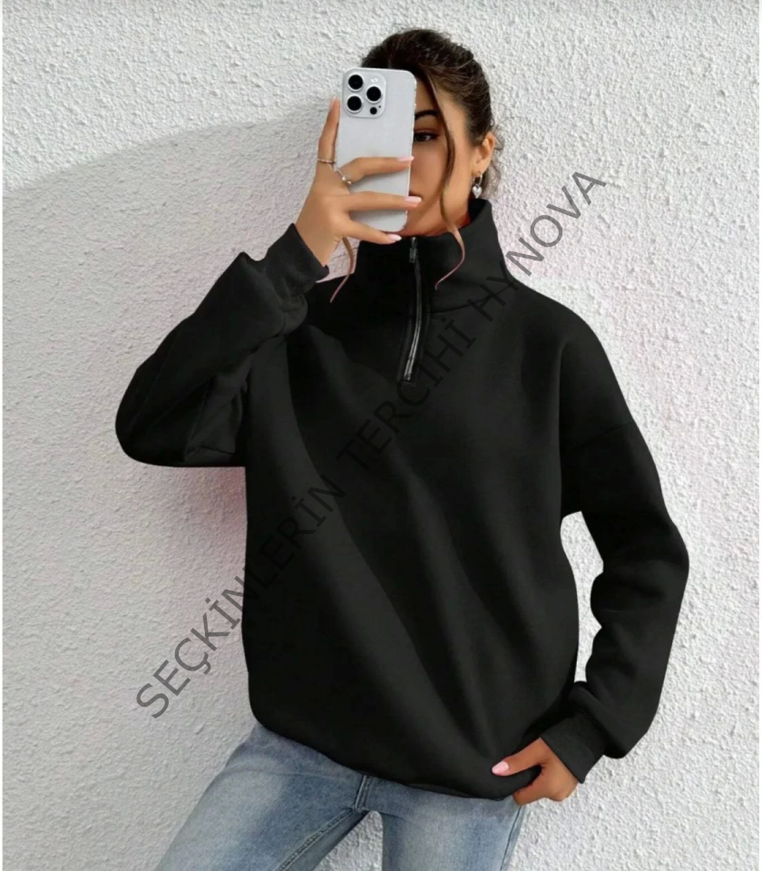 Unisex Uzun Kol Yarım Farmuarlı Yakalı Basic SweatShirt - Siyah