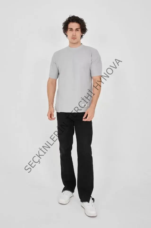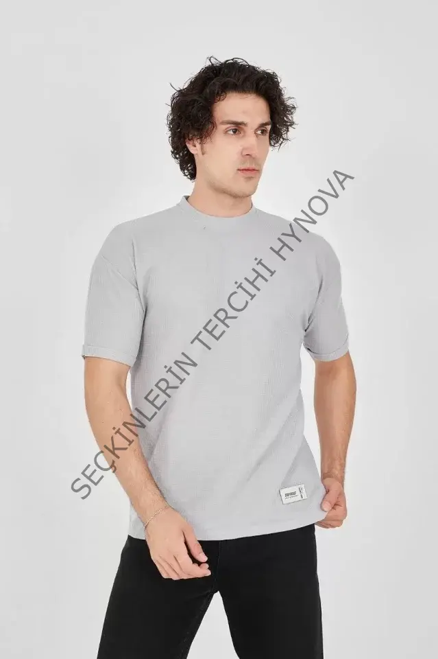 Unisex Waffle Kumaş Rahat Kol T-Shirt - Boyalı Gri