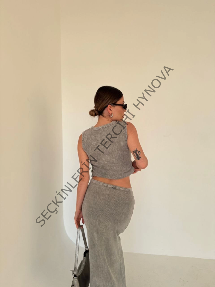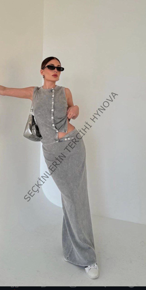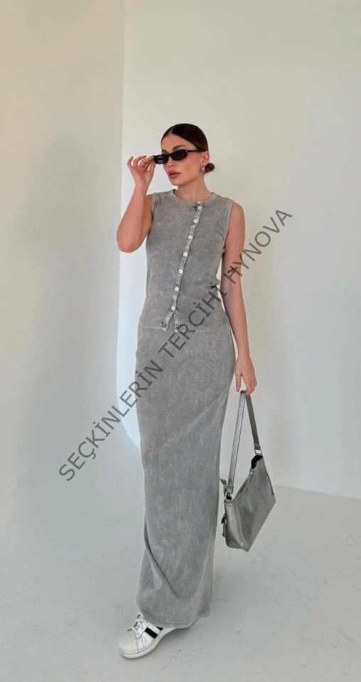 Uzun Etekli Önü Düğmeli Badi İkili Takım- Gri