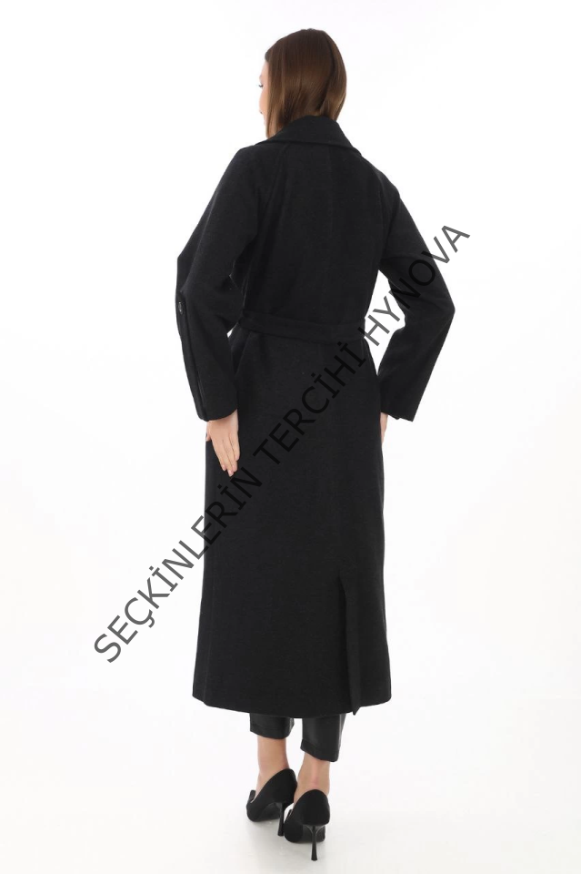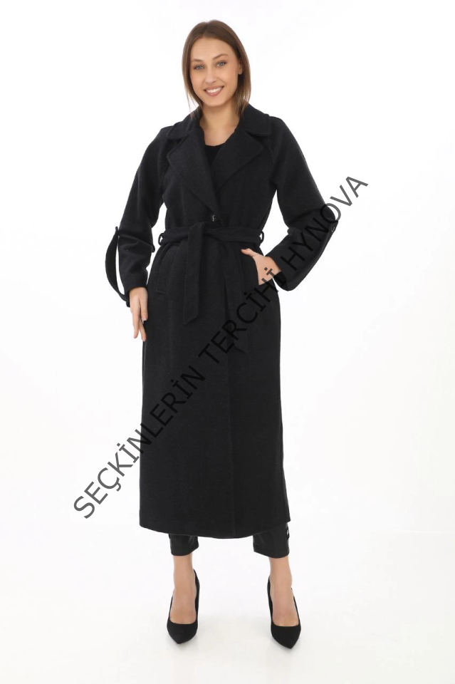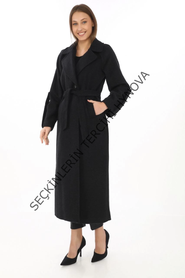 Uzun Kaşe Kaban – Yünlü Dokuma Kaşmir Kumaş, Kruvaze Yaka, Kuşaklı Astarlı Tesettür Uyumlu Şık Kışlık Siyah Model - Siyah