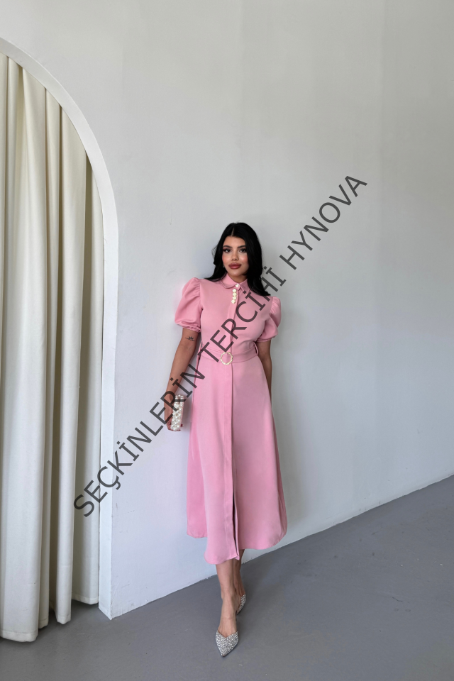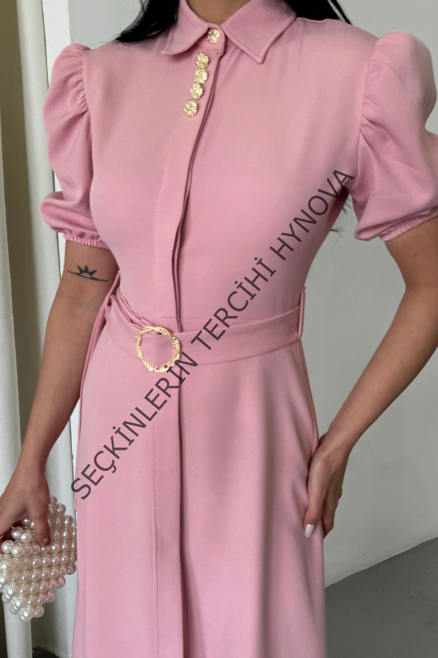 YAKA DÜĞME DETAYLI ELBİSE- Pembe