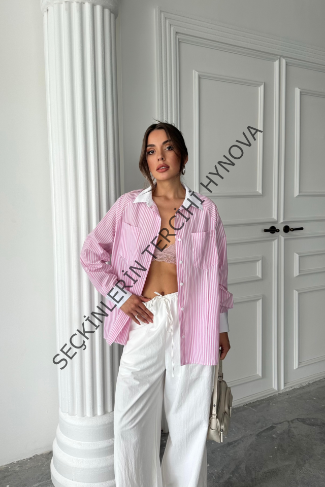YAKA VE MANŞET BEYAZBOYFRİEND ÇİZGİLİPOPLİN GÖMLEK - Pembe
