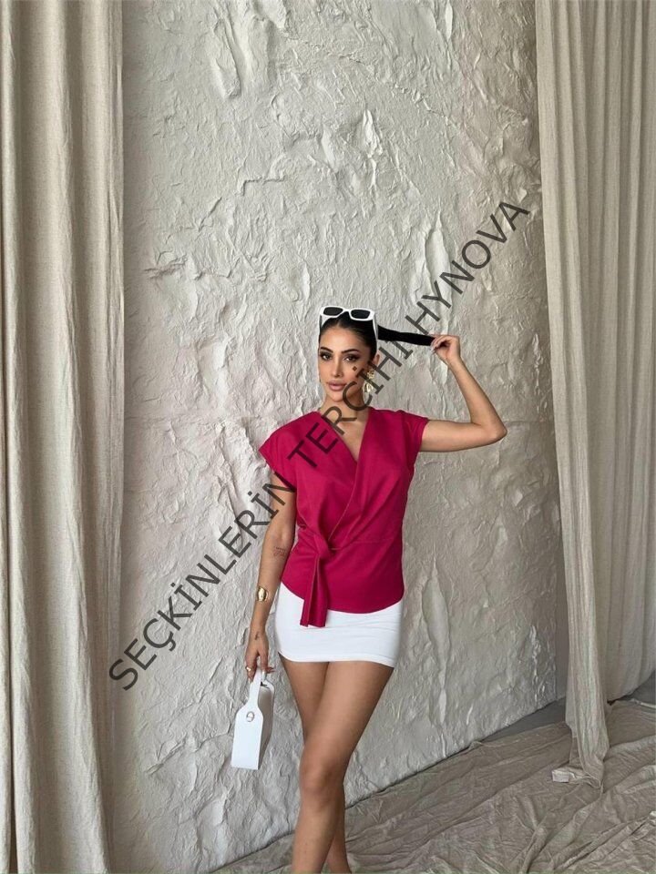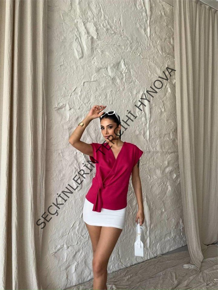 YANDAN BAĞLAMA DETAYLI KOLSUZ BLUZ - Fuşya