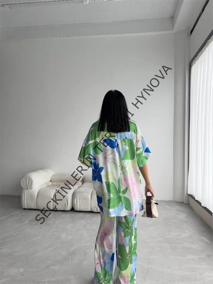YEŞİL BÜYÜK ÇİÇEK DESEN SATEN GÖMLEK-PANTOLON TAKIM - Yeşil