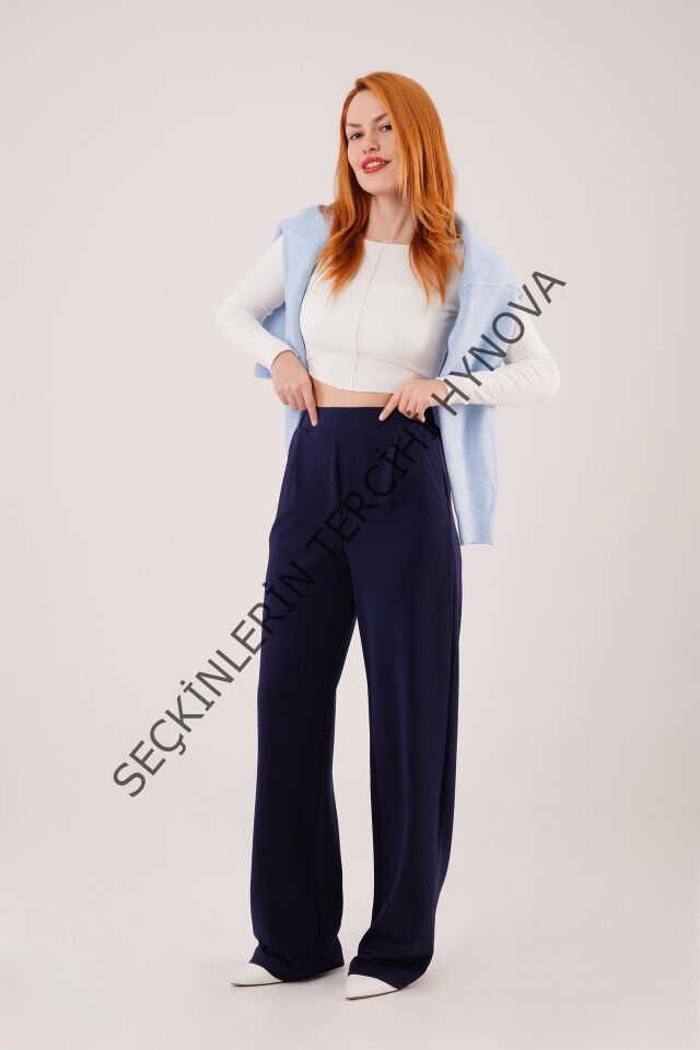 Yüksek Bel Bol Paça Krep Lacivert Pantolon
