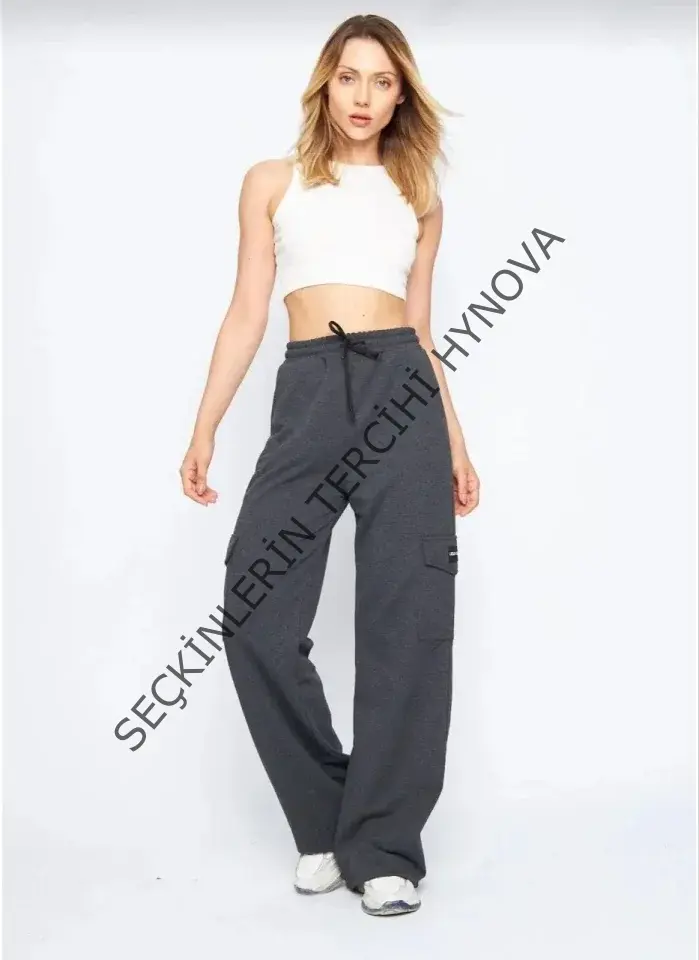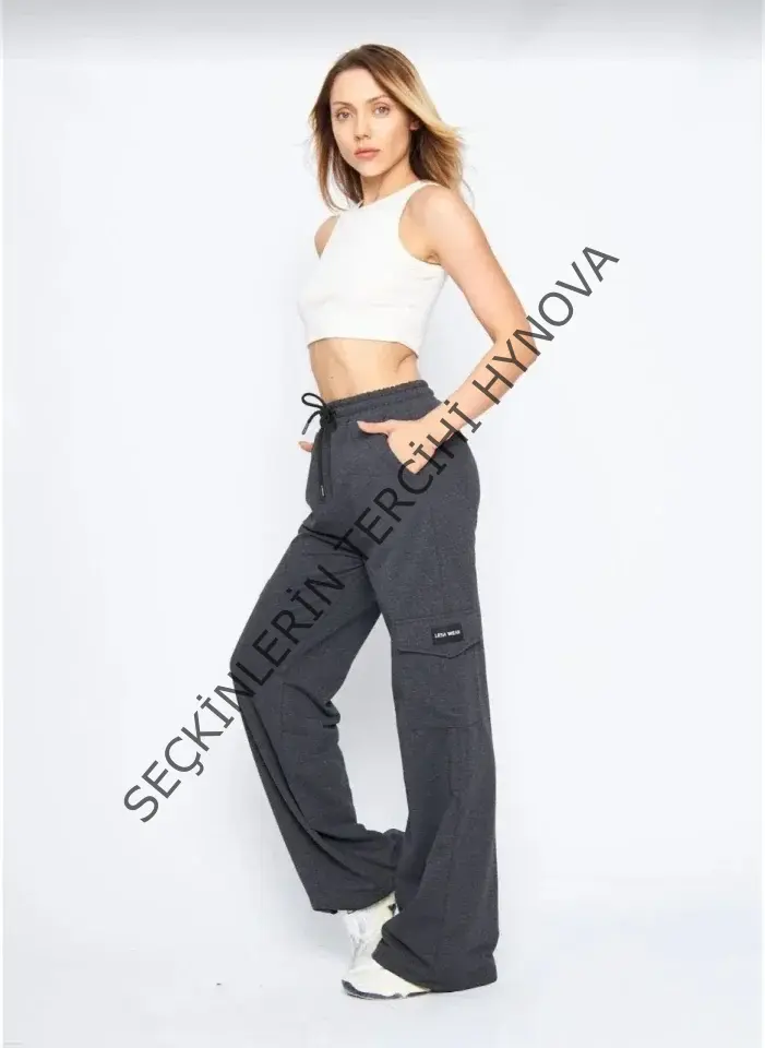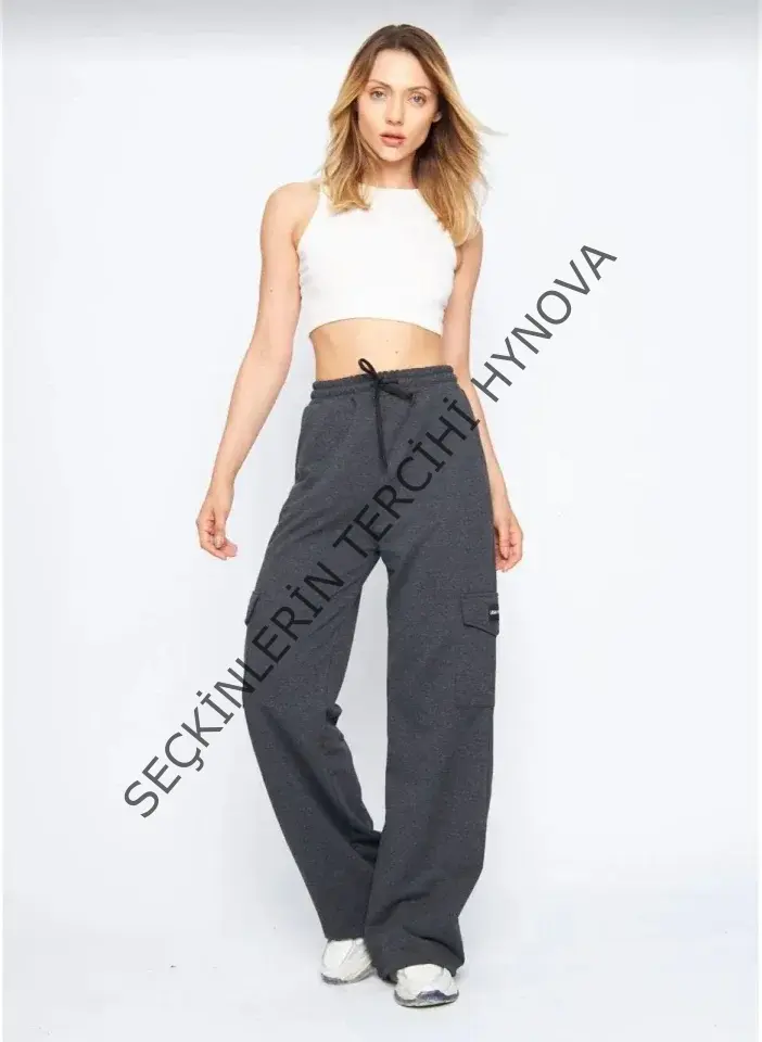 Yüksek Bel Kargo Cepli Palazzo Pantolon Oversize Bol Paça İki İplik Rahat Kesim - Antrasit